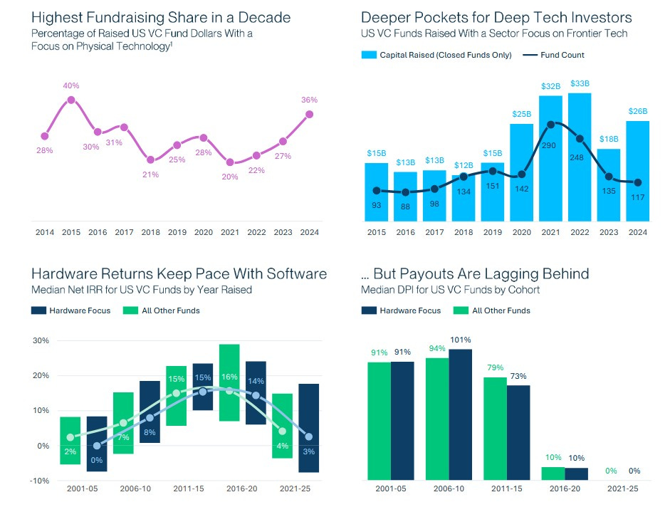 VC funding in 2024 surged 47% YoY, with hardware‑focused funds capturing one‑third of capital—the strongest hardware pull in ten years and a clear sign investors are doubling down on physical‑world innovation. (Silicon Valley Bank)